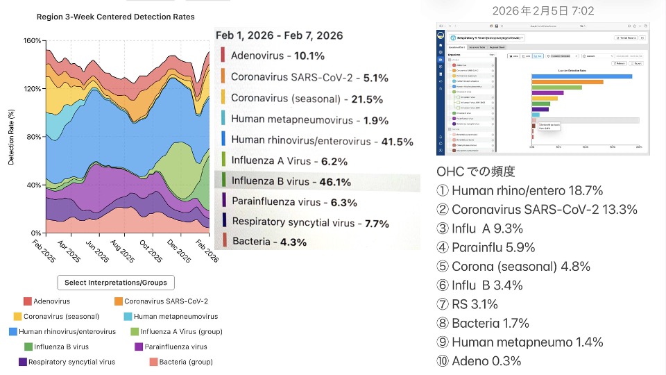 日本全国の感染症(BIOFIRE症候群の傾向)(Feb 1st〜7th)(左)、(中:頻度)と当クリニックの2月5日までの発熱外来のリアルタイムデータ(右棒グラフとOHCでの頻度)をお知らせします。公式ラインではメモリーの関係で画像はこちらのホームページに投稿します。